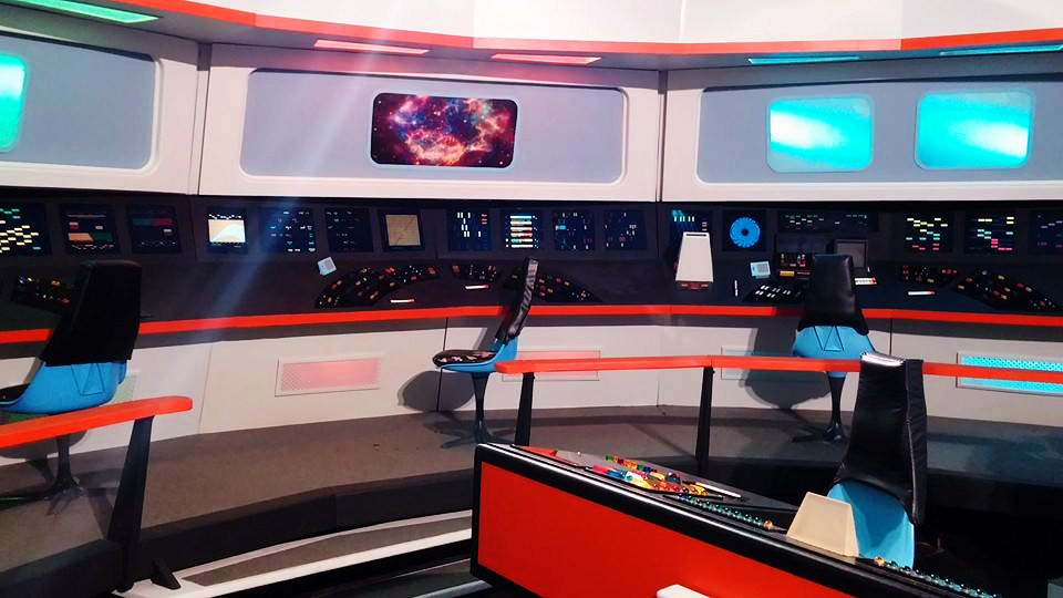The second leg of the central Oklahoma space pilgrimage took us to Oklahoma City proper, in a part of town that we might not have visited otherwise but for the presence of a starship. In a rented space next to a roofing repair company in Oklahoma City is one of the only two 360-degree classic Star Trek bridge sets in the United States, replicating – if not improving on – the Enterprise set from the original ’60s series.